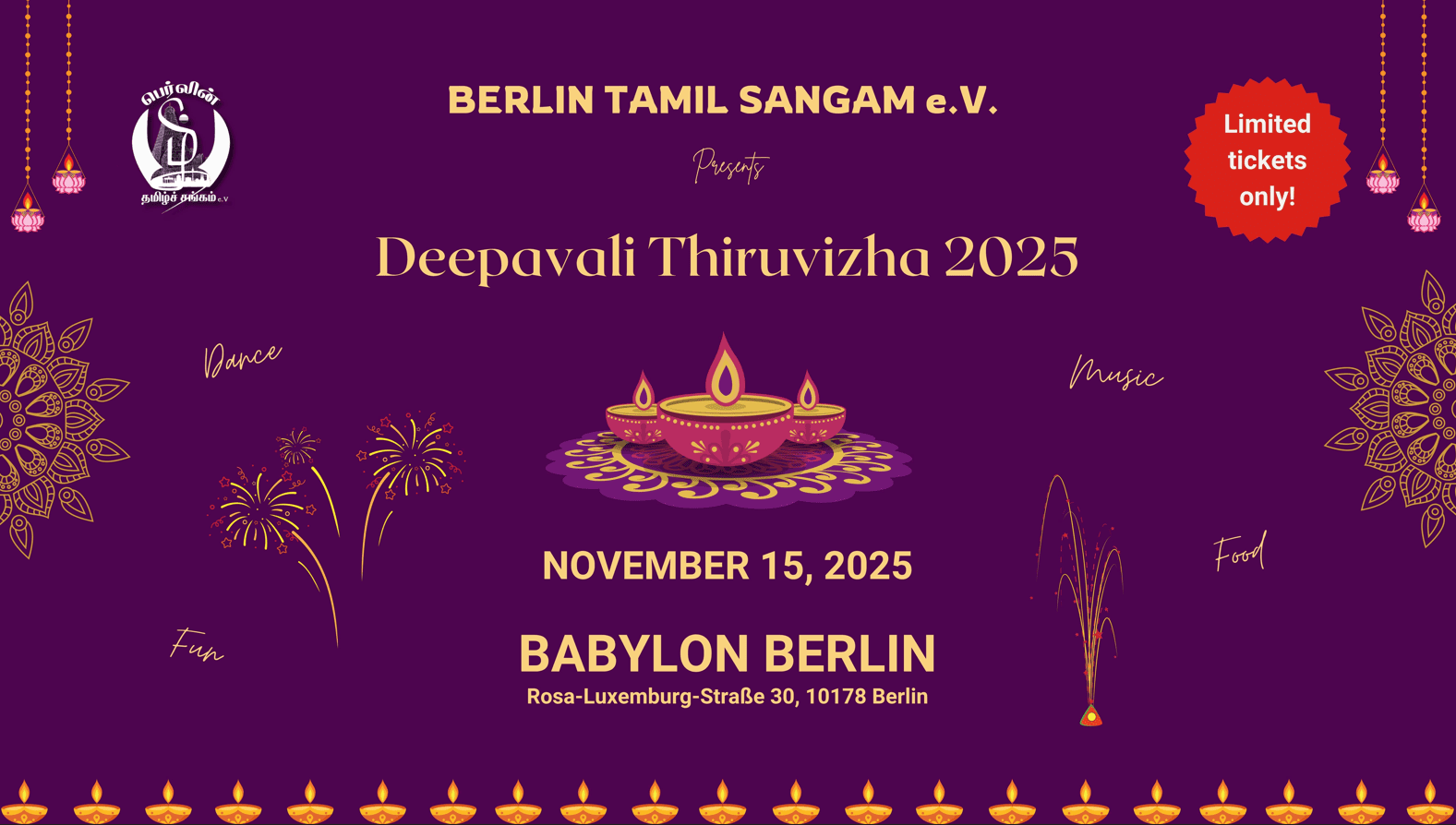 Get ready for the grand celebration of lights, laughter & culture! โจ Join us at Deepavali Thiruvizha 2025 ๐๐ถ ๐ Nov 15 | ๐ 2 PM | ๐ Babylon Theater, Berlin Letโs make this Diwali unforgettable! โค