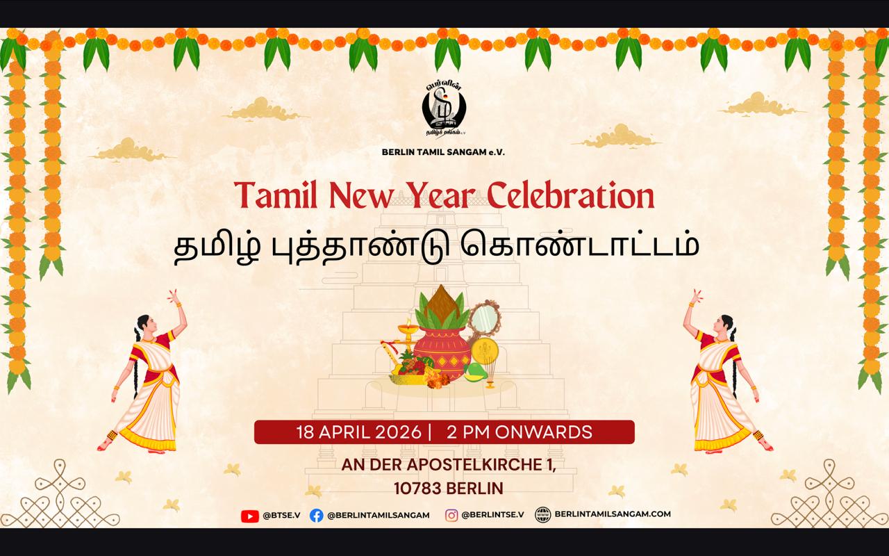 We cordially invite all to our Tamil New Year Celebration on 18.04.2026 at An der Apostelkirche 1, 10783 Berlin. The event starts at 2PM. Checkin starts at 1PM. Event is expected to end at 7PM.